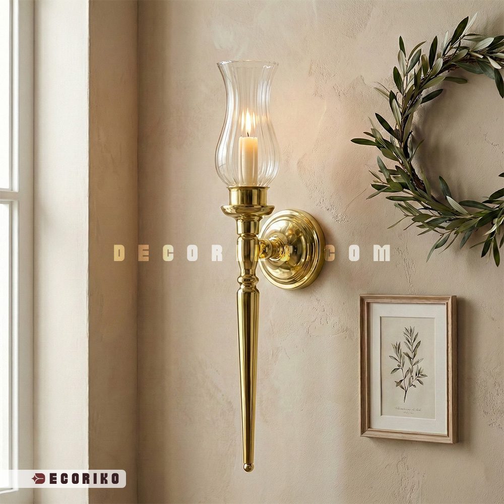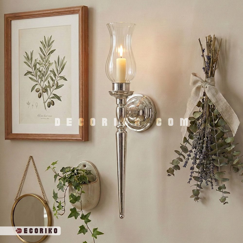 حباب شیشه‌ای و خوش‌تراش بالای کار، نه تنها از خاموش شدن شمع جلوگیری می‌کند، بلکه نور را به شکلی ملایم و رویایی در فضا پخش می‌کند. این شمعدان دیواری انتخابی عالی برای نصب در دو طرف تابلوهای نقاشی، بالای کنسول یا حتی در ورودی منزل است تا حس خوش‌آمدگویی گرمی را به مهمانان منتقل کند. 🕯️