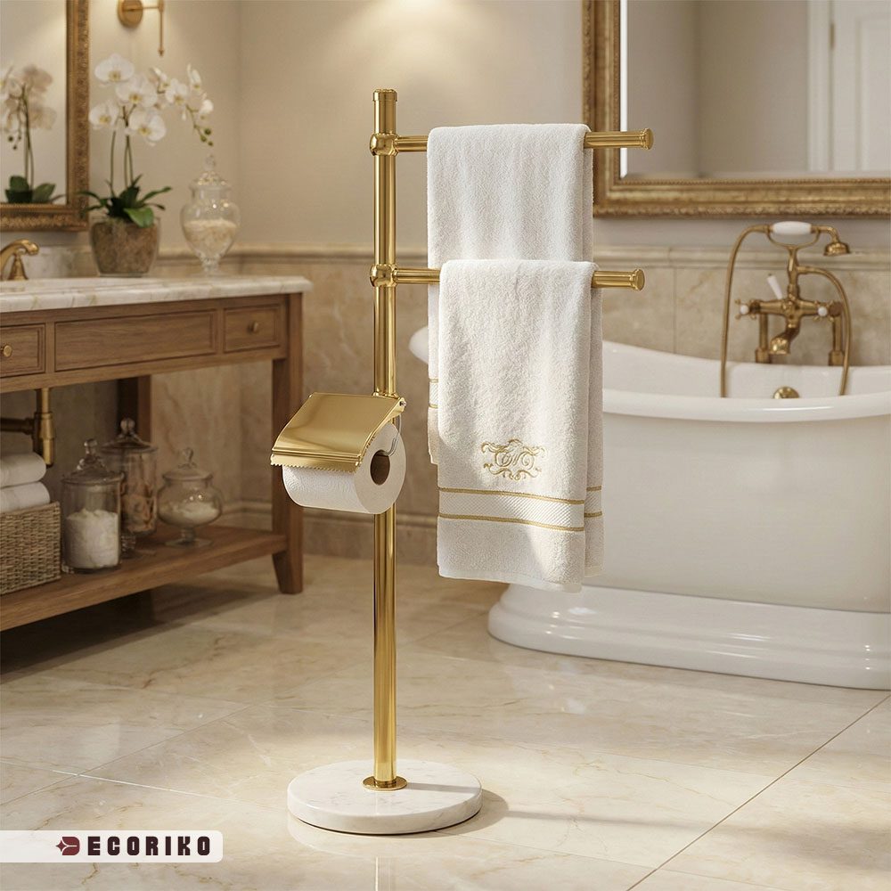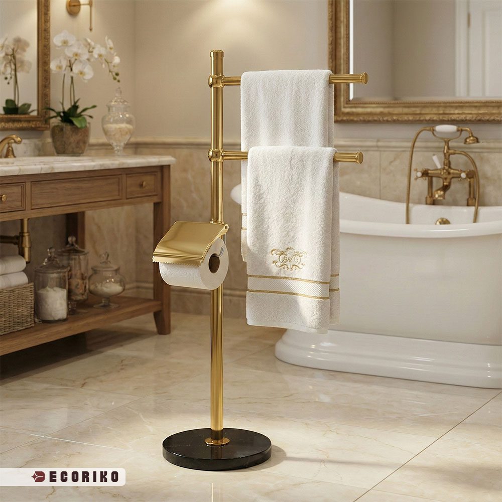 یکی از نگرانیهای همیشگی در مورد استندهای ایستاده، لقزدن یا افتادن آنهاست؛ اما در این مدل، استفاده از سنگ طبیعی سنگین در پایه، ایستایی فوقالعادهای به آن بخشیده است. دیگر نگران افتادن پایه هنگام برداشتن دستمال نباشید. بدنه فلزی این کار با آبکاری طلایی باکیفیت پوشیده شده که علاوه بر درخشش خیرهکننده، در برابر رطوبت محیط سرویس بهداشتی و حمام کاملاً مقاوم است و سیاه نمیشود. 🛁
