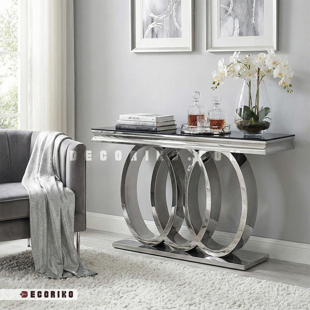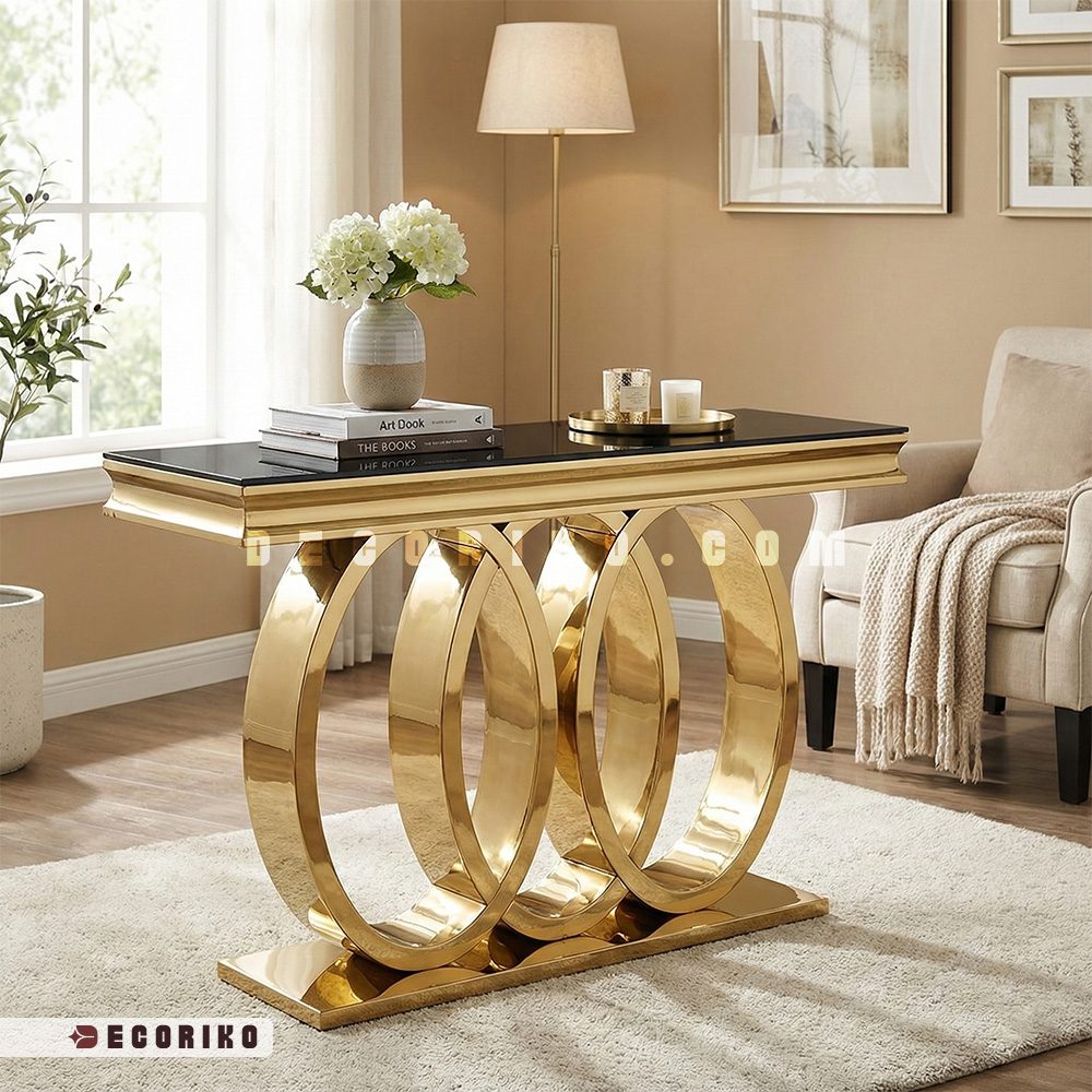 این کنسول یک میز معمولی نیست؛ یک اثر هنری با الهام از طراحی هندسی و سیال است. پایههای این میز با فرمی شبیه به سه حلقه در هم تنیده طراحی شده است. این فرم منحنی، خشکی خطوط صاف دکوراسیون را میشکند و جریانی از لطافت و مدرنیته را به فضا تزریق میکند.