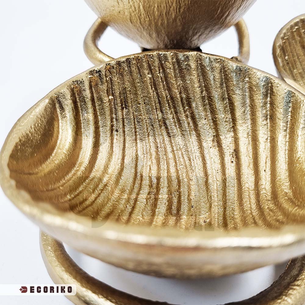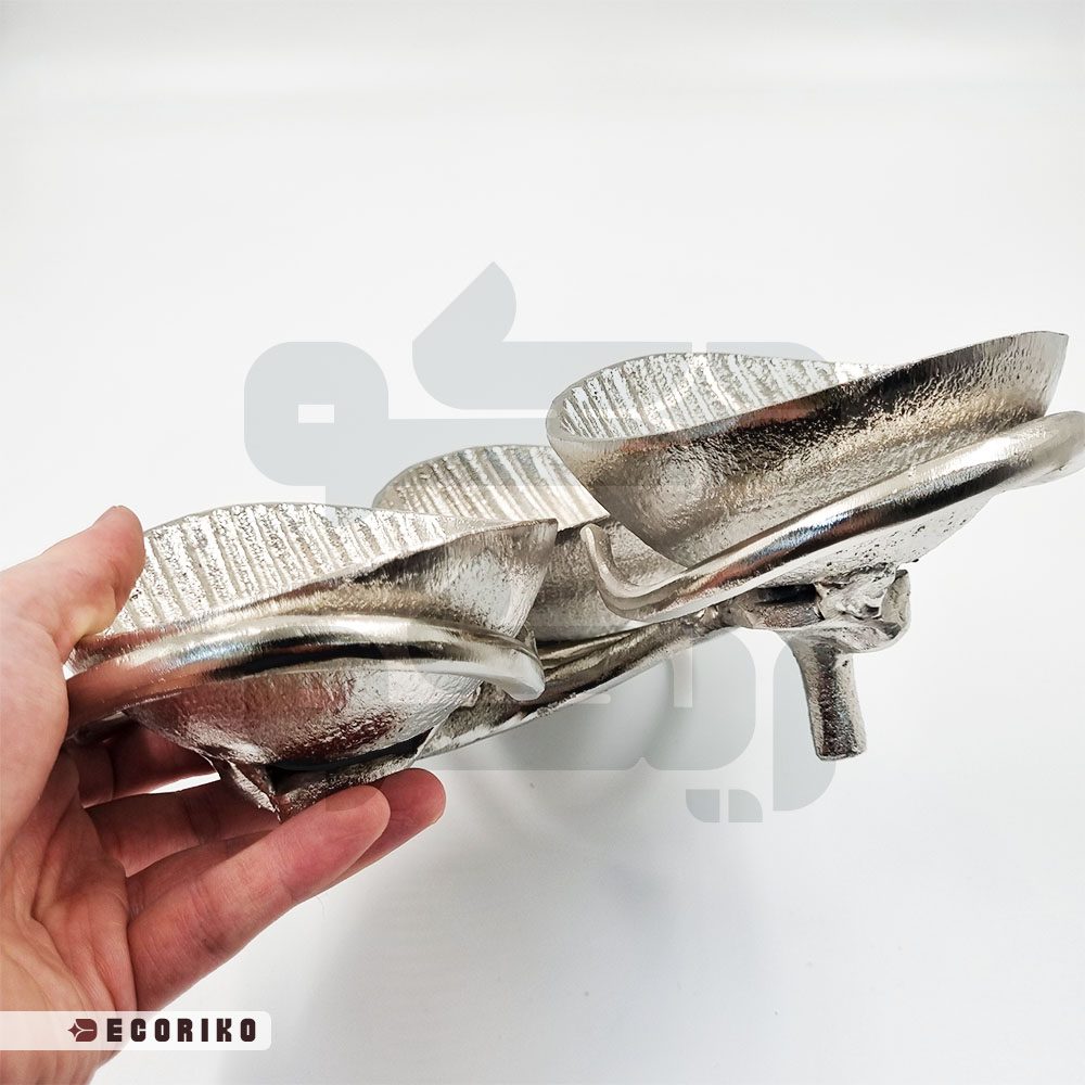 این ظرف زیبا از جنس آلومینیوم ساخته شده که علاوه بر سبکی، مقاومت بسیار بالایی در برابر تغییر رنگ دارد. طراحی بدنه آن با خطوط برجسته و نامنظم، یادآور ردِ امواج دریا روی شنهای ساحل است و حس زندهای به فضا میبخشد. مدل اوشن دارای سه کاسه متصل به هم است که روی پایههایی حلقهای شکل و ظریف قرار گرفتهاند.