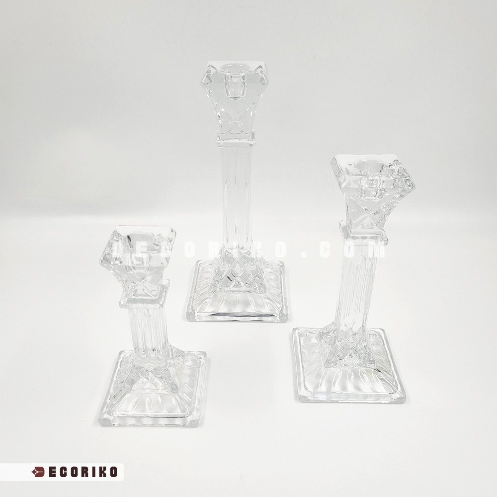 این ست شامل سه شمعدان با ارتفاعهای مختلف است که وقتی در کنار هم قرار میگیرند، هارمونی بسیار زیبایی ایجاد میکنند. جنس این کار از کریستال بسیار شفاف و باکیفیت است که به مرور زمان کدر نمیشود. ویژگی متمایز این مدل، تراشهای ظریف روی بدنه و پایه مربعیشکل و محکم آن است. این تراشها مثل منشور عمل میکنند و وقتی نور شمع (یا حتی نور محیط) به آنها میتابد، بازتابی رنگین و چشمنواز ایجاد میکنند که نگاه هر بینندهای را به خود جلب میکند.