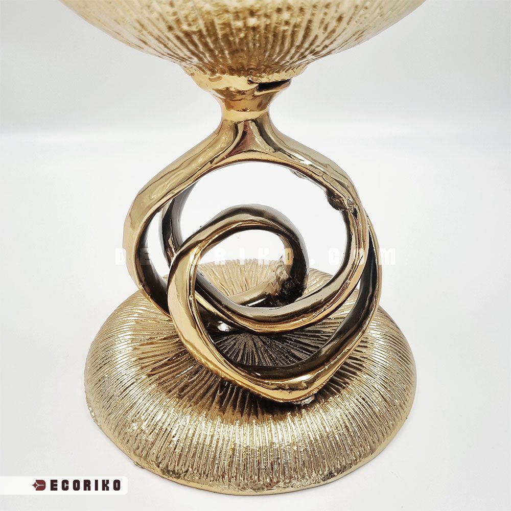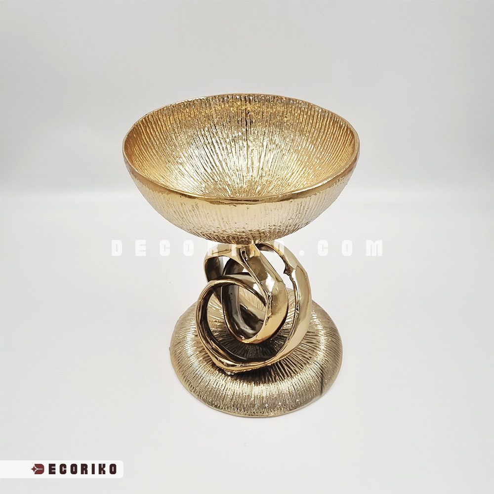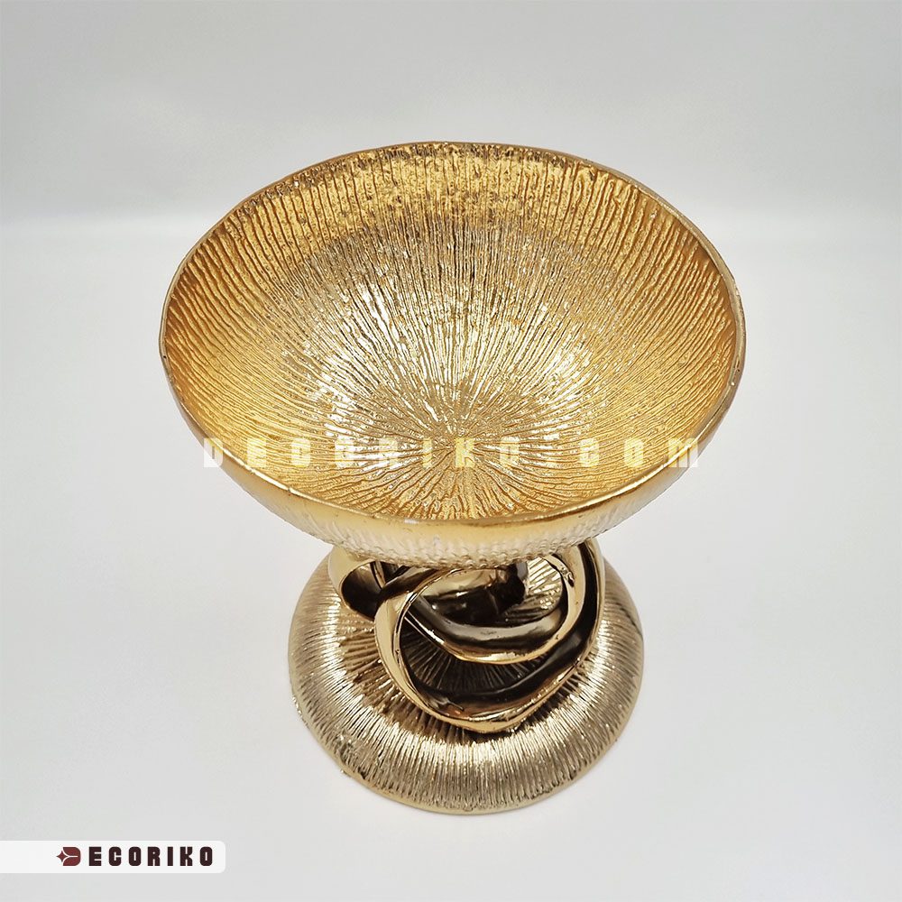 جنس بدنه این محصول از آلومینیوم است که با آبکاری طلایی بسیار باکیفیت پوشانده شده؛ بنابراین خیالتان از بابت تغییر رنگ یا سیاه شدن آن راحت باشد. بافت شیاری (خورشیدی) داخل کاسه و پایه‌ی در هم تنیده و گره‌خورد‌ه‌ی آن، ظاهری هنری و مجسمه‌گونه به این ظرف بخشیده است. این یعنی حتی زمانی که ظرف خالی است، به عنوان یک دکوری لوکس روی میز می‌درخشد.