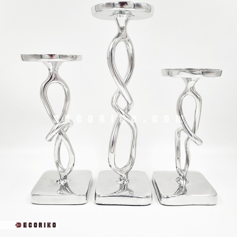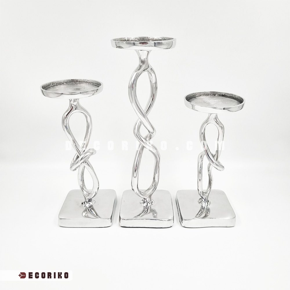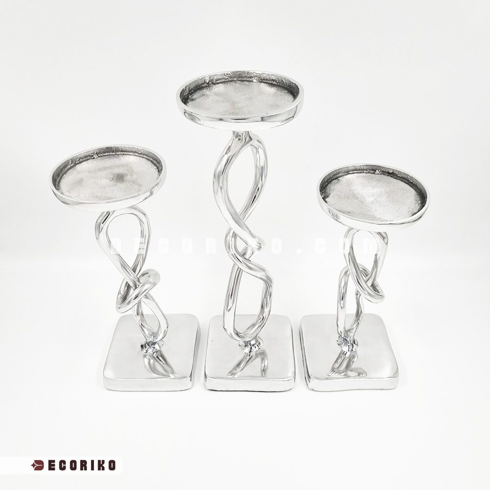 جنس این شمعدان‌ها از آلومینیوم پرداخت شده و بسیار باکیفیت است؛ به این معنی که درخشندگی رنگ سیلور (نقره‌ای) آن ثابت بوده و برخلاف بسیاری از فلزات دیگر، سیاه نمی‌شود و زنگ نمی‌زند. اختلاف ارتفاع در این سه سایز، به چیدمان شما عمق می‌دهد و وقتی شمع‌ها را روشن می‌کنید، رقص نور روی بدنه براق و پیچ‌دار این جا شمعی‌ها، فضایی رویایی و رمانتیک می‌سازد.